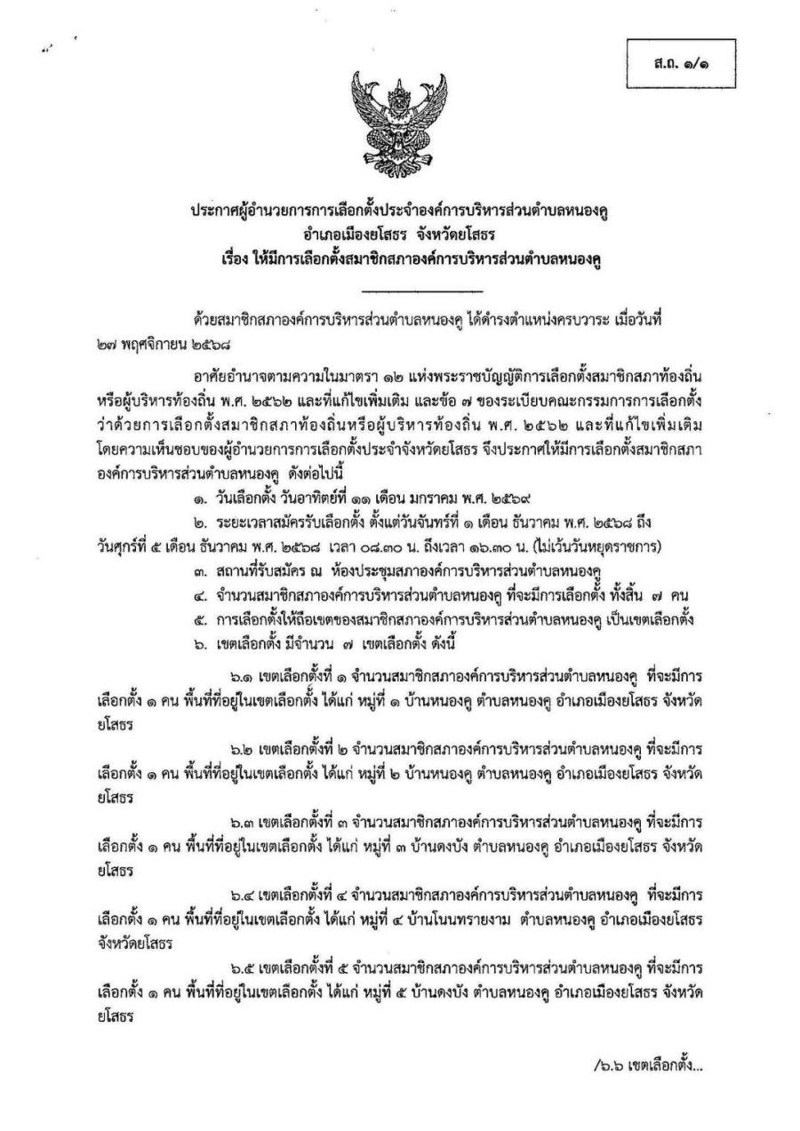 ประกาศผู้อำนวยการเลือกตั้งประจำองค์การบริหารส่วนตำบลหนองคู เรื่อง ให้มีการเลือกตั้งสมาชิกสภาองค์การบริหารส่วนตำบลหนองคู